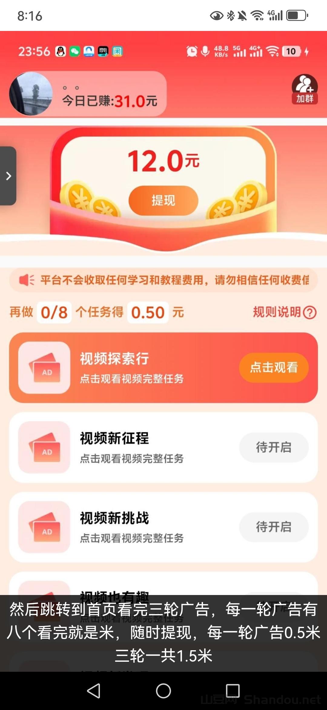 4.然后跳转到首页看完三轮广告,每一轮广告有八个看完就是米,随时提现,每一轮广告0.5米 三轮一共1.5米